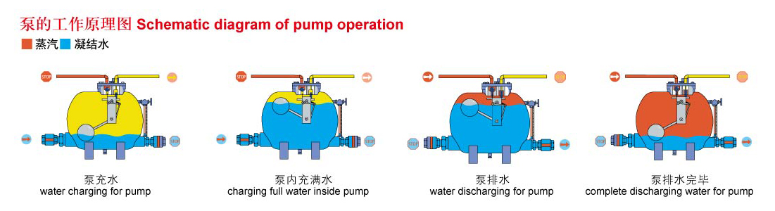 冷凝水控制泵靠蒸汽或壓縮氣體排出液體。浮球聯到連桿上和彈簧上,同時驅動進汽閥和排氣閥。在充液循環中,進汽閥關閉,同時排氣閥打開,使冷凝水充入泵體內。當浮球隨液位升高到其行程的頂點時,開關控制機構放開彈簧,打開進汽閥,關閉排氣閥。蒸汽或壓縮氣體流入泵內,排出液體。裝在泵進口和出口的逆止閥,使液體在逆止閥的通路方向上流動。