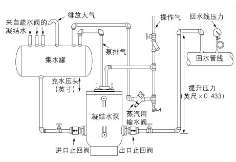 凝結水控制泵把開口集水罐內的冷凝水排入可能有壓力的高架冷凝水回液管內。為了安全,如果使用蒸汽驅動時,泵的排氣口和集水罐應通大氣。